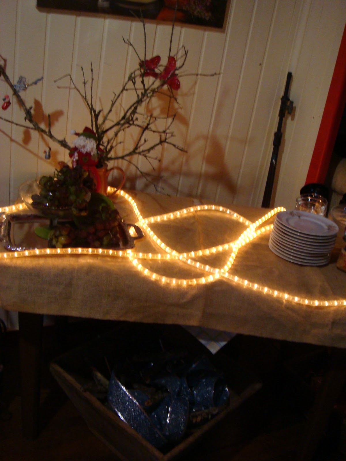 O galho enfeitado ficou lindo demais e as luzes correndo pela mesa deram um charme todo especial.